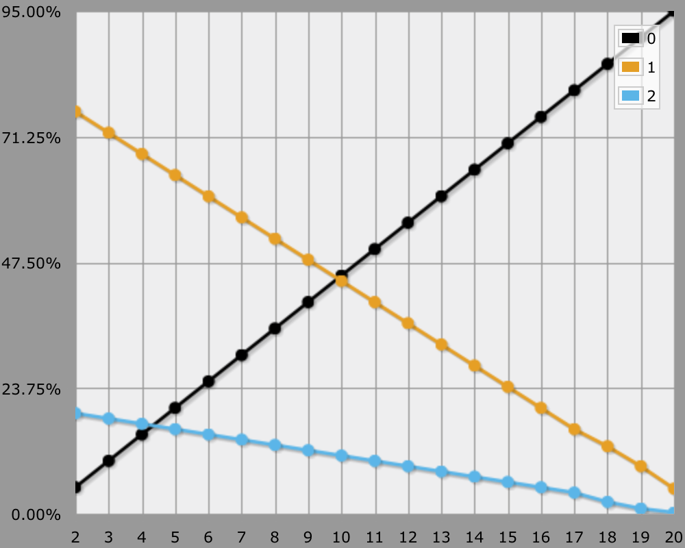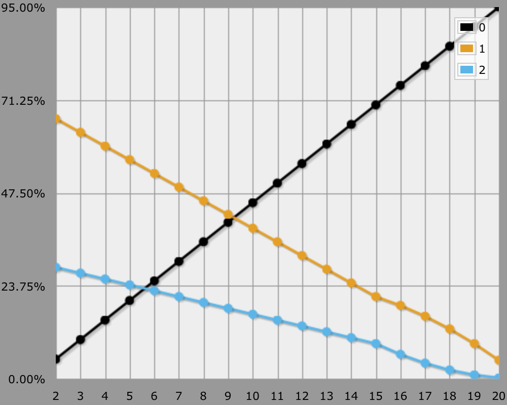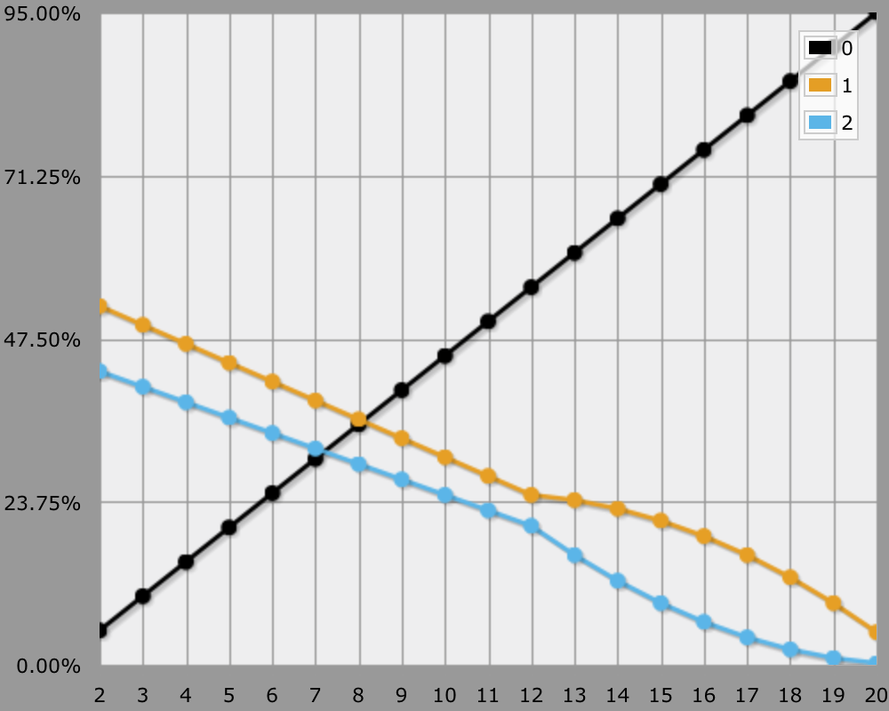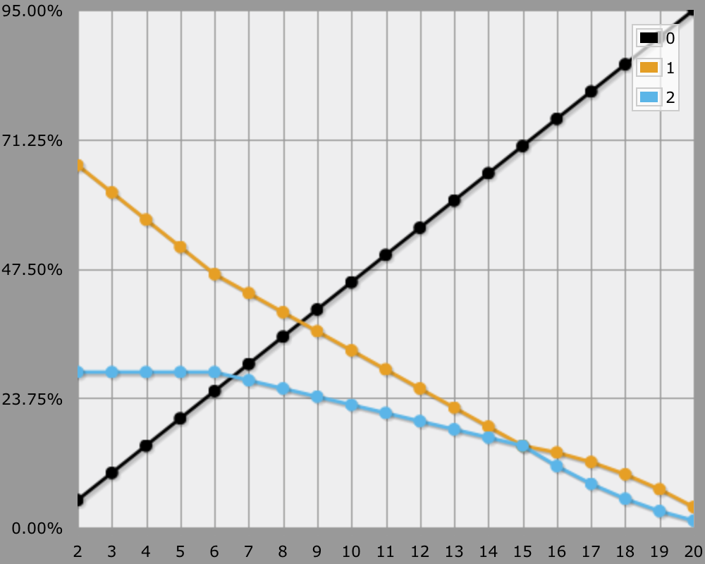 The above threat ranges are the most common. You can use the previously mentioned AnyDice program to compute any other treat range you like. Just for fun, here's the graph for threat range 2–20.