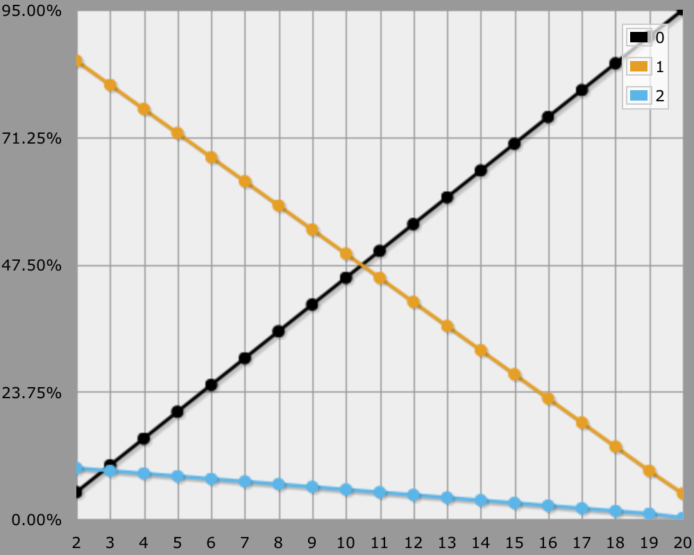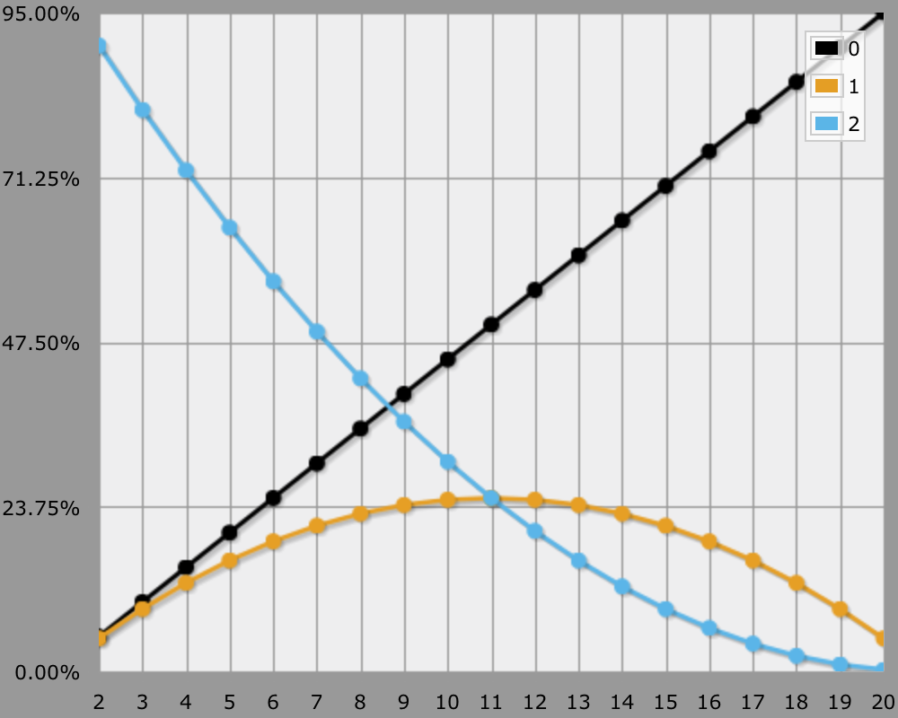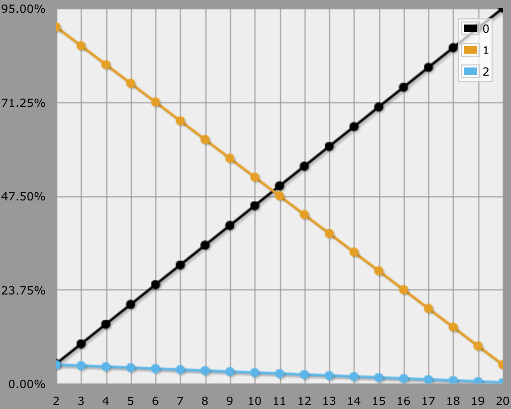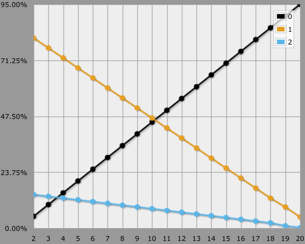 The above threat ranges are the most common. You can use the previously mentioned AnyDice program to compute any other treat range you like. Just for fun, here's the graph for threat range 2–20.